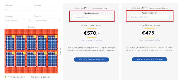Deze vergelijking is voor uw eigen dak terug te vinden via onze online rekentool. We vergelijken twee verschillende panelen, gesitueerd op uw eigen dak. Op deze manier krijgt u een goeie indicatie van wat de besparing kan zijn met twee verschillende merken panelen.