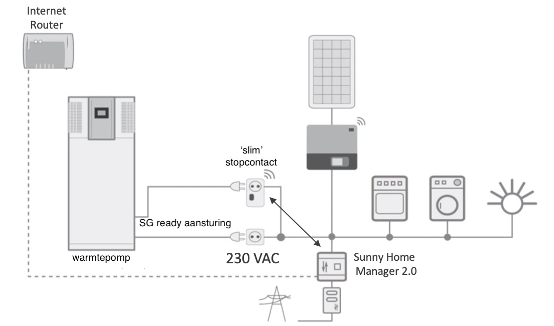 Warmtepomp met Smart-Grid ready sturing via een relais. De Sunny Home Manager geeft het signaal via de router aan het relais