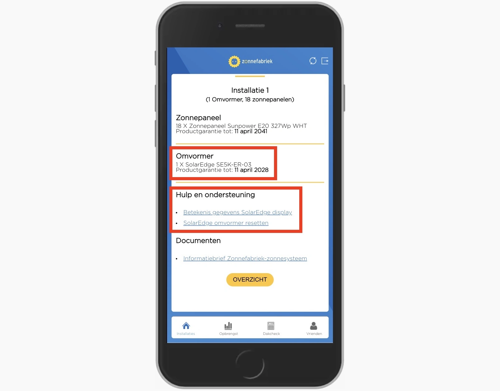 In de Mijn Zonnefabriek app vindt u, naast de opbrengst, ook informatie over uw systeem (wat voor omvormer, wat voor panelen), de garantie (tot wanneer heeft u garantie op de producten), en tips (bijvoorbeeld: wat betekenen de lichtjes op de omvormer, hoe verander ik het wifi wachtwoord in de omvormer, enz.). Verder kunt u via de app ook nieuwe klanten aandragen, en daarmee €75 verdienen wanneer die klanten tot aanschaf van een systeem overgaan.